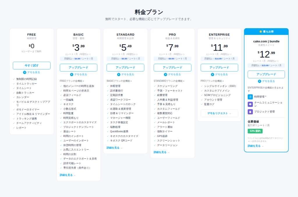 ClockifyのENTERPRISEプランの機能に加え、CAKE.comの他の2製品もセットで利用可能になります。